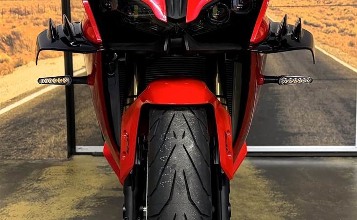 Die originalen Spiegel wurden demontiert und durch hochwertige, gefräste Lenkerendspiegel ersetzt, die dem Motorrad eine klare, moderne Linie verleihen. Die dabei entstehenden Öffnungen an der Verkleidung werden mit präzise gefertigten Spiegelabdeckungen verschlossen, die in verschiedenen Farben erhältlich sind und sich perfekt ins Gesamtbild integrieren.